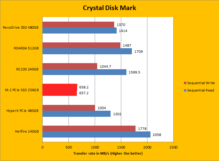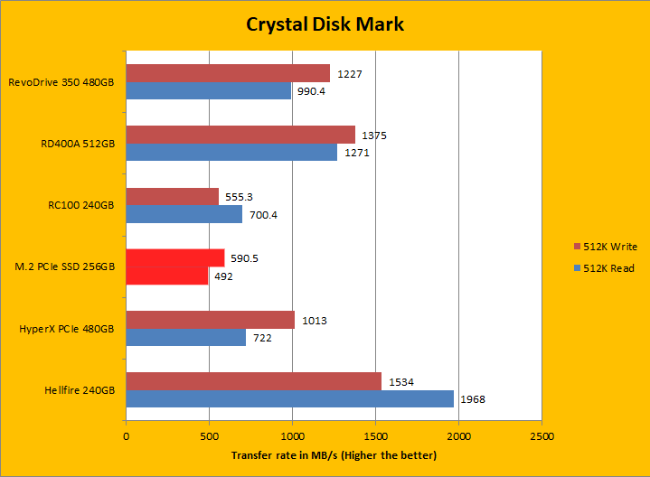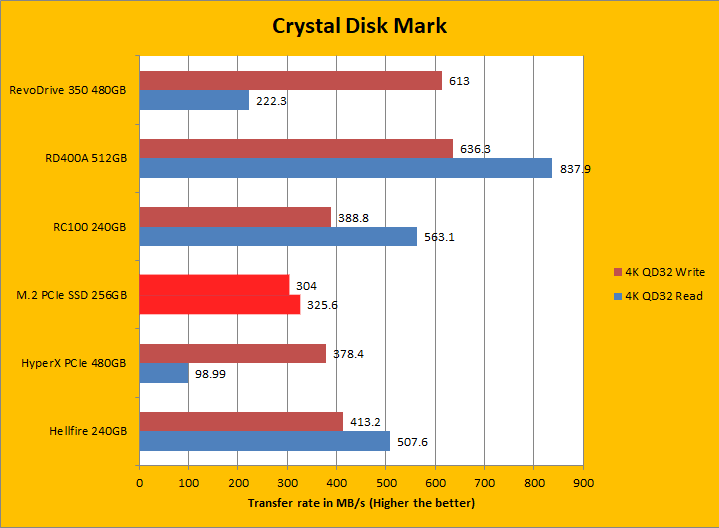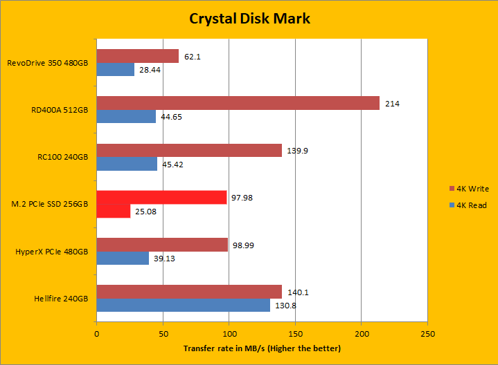 Crystal Disk Mark 3.0 is next in the ring. Generally, higher capacity drives tend to perform a little better in these tests. The ability of a controller and flash memory to deliver high IOPS also results in better rated speeds. The Gigabyte M.2 PCIe SSD 256GB is rated at up to 80,000 IOPS read and 150,000 IOPS write. Looking at the sequential read and write results, this Gigabyte M.2 SSD PCIe 256GB fell behind the rest of the pack. This was probably the most surprising result, especially since Crystal Disk Mark sometimes reflects similar numbers as our first two benchmarks, albeit at differing magnitudes. In the 512K section, the M.2 PCIe SSD ranked last in reads and second to last for writes. Moving to the 4K results, the Gigabyte M.2 drive read performance was behind everyone, while the write performance was just a bit closer to being competitive, despite still coming in fifth. This is again a similar story in the 4K QD32 test, with both its read and write speeds being ranked in the bottom half of these drives. From all of these tests, you can see the budget nature of the M.2 PCIe SSD, even falling behind the closely priced Toshiba RC100 240GB. Compared to the recently reviewed SATA-based SSDs, these performance numbers are much closer to these drives in performance. In addition, the M.2 PCIe SSD starts getting outclassed in the 4K and 4K QD32 tests for both read and write results.