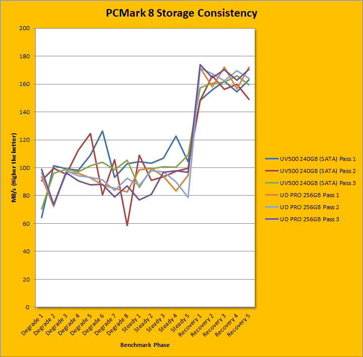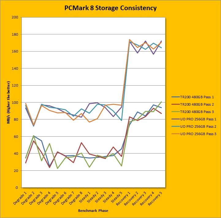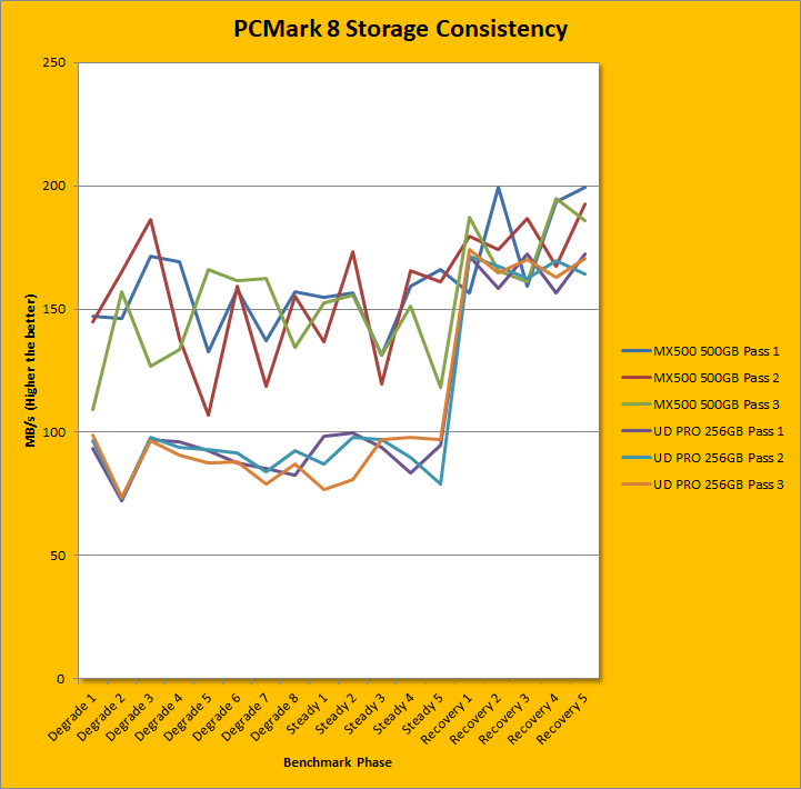 PCMark 8 Storage Consistency Test is one of our favorite benchmarks, but also one of the more taxing ones too. Nowadays, many drives are well optimized for high benchmark scores when they are empty, but what separates the professional players from the amateurs is how it stands up to a truly punishing workload. PCMark 8's Storage Consistency Test is designed exactly for this purpose. Going through five phases -- precondition, degradation, steady state, recovery, and clean up -- to extend beyond real world application simulations, this benchmark takes around two days to complete, but the results are revealing of a SSD's true capabilities. Overall, the Gigabyte UD PRO 256GB's results were poor for its class. I have decided to compare it from one of each of the recent budget drives from each manufacturer, which includes Kingston, Crucial, and Toshiba OCZ. In the first chart, where it was compared against the Kingston UV500, the UD PRO was on average, 8% and 10% slower in its degradation and steady phases, respectively, and 5% faster in the recovery phases. In the second chart, where the Crucial MX500 was its rival, it performed slower by 40%, 39%, and 7% slower in degradation, stead, and recovery phases respectively. In the third chart, where it was compared against the Toshiba OCZ TR200 480GB, the UD PRO was faster by 124%, 151%, and 93% in degradation, steady, and recovery phases. However, the last result was more astonishing because of the slowness of the TR200. I will say however, the scores are pretty consistent across each of the phases, which is a good thing.