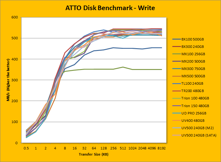 Following up next is our usual ATTO read and write tests. ATTO is an often-quoted benchmark, because it is easy to use and accurate. For the most part, it is a favorite among reviewers. ATTO uses easily compressible data, so compression-heavy controllers will perform very well here. As manufacturer peak read and write performance ratings are usually achieved using ATTO, whether a drive lives up to its marketing claims or not can be validated by this program. Gigabyte claims the UD PRO's maximum read and write are pinned at 530MB/s and 500MB/s, respectively. According to our tests, these numbers were slightly underrated. It peaked at 565.789MB/s read and 521.233MB/s write. In terms of ramp-up, the Gigabyte UD PRO was a bit slower to peak than other drives, especially at the lower end of the packet sizes. The write results were somewhat similar to the Kingston UV500 M2 edition, though with a slower ramp-up at the beginning. Meanwhile, the UD PRO's read curve was mixed with the Kingston UV500, which meant for a slower ramp than the OCZ Trion 150 or the Kingston UV400. The read curve was similar in ramp-up to the Crucial BX300 and MX500.
