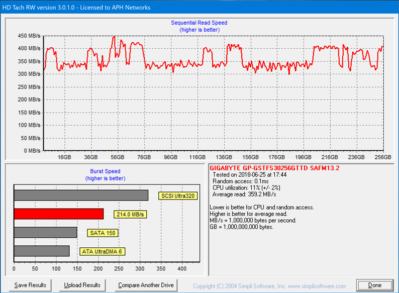 After giving the Gigabyte UD PRO 256GB a clean format and ensuring alignment and everything is correct, I fired it up for some testing in HD Tach. HD Tach is more of a drag race than a clear indication of real life performance and has been around for a really long time. It is an excellent storage performance reference among SSDs with the same controller, and has been our favorite benchmark long before hard drives even cracked the 50MB/s mark. With an average read speed of 359.2MB/s according to HD Tach in single disk configuration, this score is good, besting out the Kingston UV400 and UV500. For most solid state drives, we typically look for something that is faster than 350MB/s, as many drives do not crack the 400MB/s rating. Its burst speed rating is however oddly low at 214.0MB/s. At the end of the day, HD Tach may not be the best test for solid state drives all the time, but these results are always interesting to look at.