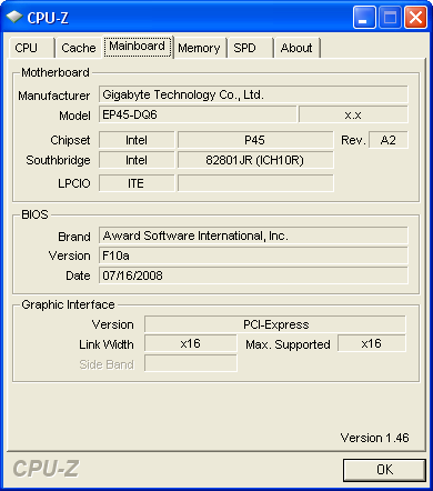 CPU-Z screenshot of the motherboard tab. We are using the latest stable version available on Gigabyte's website at press time; which is the F10a BIOS revision.