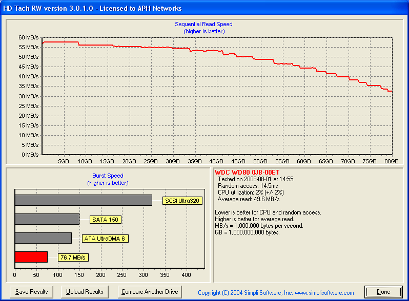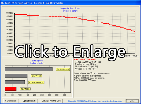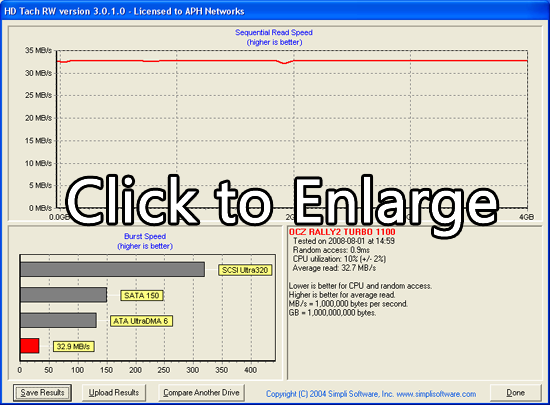 HD Tach will test the sequential read, random access and interface burst speeds of your attached storage device (hard drive, flash drive, removable drive, etc). All drive technologies such as SCSI, IDE/ATA, 1394, USB, SATA and RAID are supported. Test results from HD Tach can be used to confirm manufacturer specs, analyze your system for proper performance, and compare your performance with others. HD Tach is very easy to use, quick, and presents data in easy to read graphs, including the ability to compare two storage devices on screen at the same time for easy analysis.