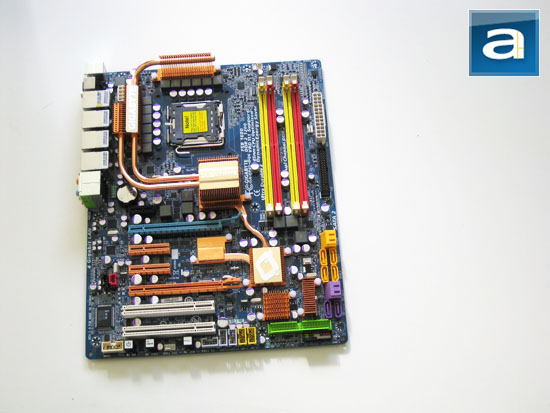 The Gigabyte EP45-DQ6, like the X48-DQ6, arrives in the trademark Gigabyte blue printed circuit board. Combined with copper heatpipes, this color combination is easily identifiable with the company's unique color scheme -- similar to how DFI and Asus all have their own combination to distinguish physically.