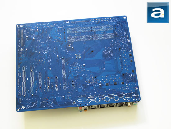 A shot at the back of the motherboard. A relatively clean design, nothing in particular here. There's none of those large "Crazy Cool" copper plates at the back to interfere with anything. Regarding the use of capacitors, the use of surface mounts are evident, as shown in the image above. Pins still stick out for other components, for example, the RAM socket pins and PCI slots -- since SMT is not capable of withstanding higher mechanical stress required for this purpose.