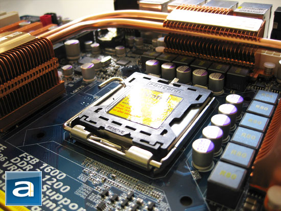 The heatpipes are routed around the CPU socket; with the copper heatpipe block over the location of the Intel P45 chip. The block is not as large as the one on the Gigabyte X48T-DQ6, but works just fine as the P45 chipset generates less heat. Generally speaking, the clearing is OK and should accommodate most CPU coolers -- the capacitors and other components will not interfere with aftermarket cooling devices.