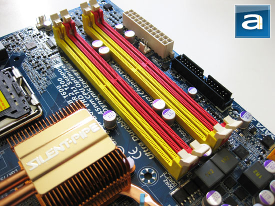 The DDR2 RAM slots are color coded in yellow and pink in correspondence to channels A and B, respectively. Precise and accurate RAM voltage adjustments are enabled by the multiphase power regulators below the RAM slots. To the top right of the RAM slots are the power phase LEDs.