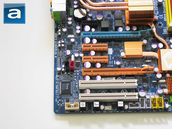 Near the bottom left corner is the ITE8720 chip providing support for a floppy drive, COM port, and PS/2 keyboard/mouse connectors. An array of components are placed along the bottom of the board as well; where an LED backlit power, clear CMOS, and reset buttons are placed for users using the motherboard without a case (Such as benchmarking or testing) -- very convenient as I've seen it on many enthusiast motherboards. It would be nice if there's a built in HDD LED as well.