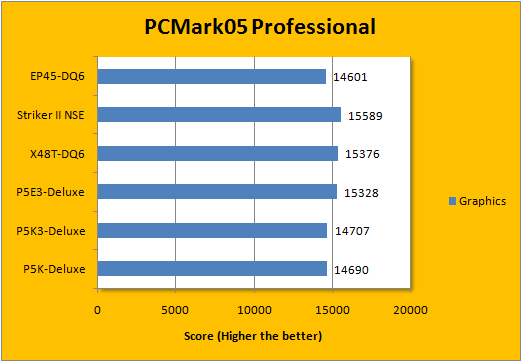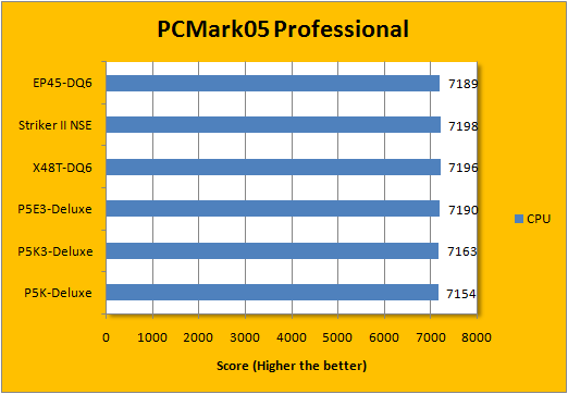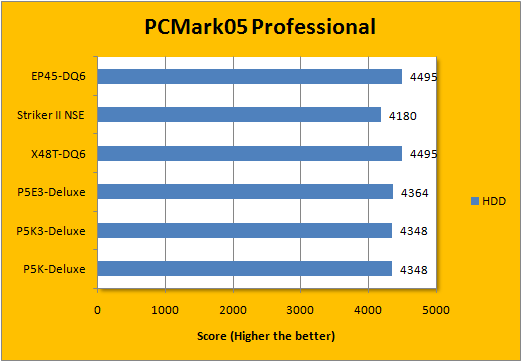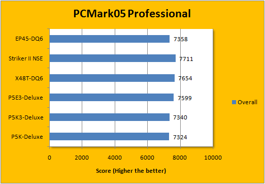 The Gigabyte EP45-DQ6 actually did pretty well in PCMark05. The CPU and HDD scores are right at the top; but fell behind in the graphics tests -- as demonstrated in our 3DMark06 results on the previous page -- as well as the Memory score significantly. The overall score is still ahead of the P5K-Deluxe and P5K3-Deluxe, though.