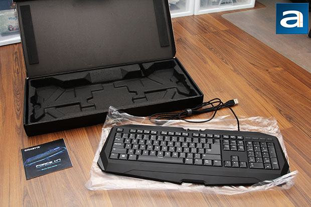 Once you flip open the box, you will realize what you get out of the box with Gigabyte's Force K7 is everything you would expect, and nothing more. The black keyboard is placed inside a molded cardboard pulp tray to prevent it from moving around inside the box, with the fix cabled routed behind the tray to keep it secure during transport. A short instructional manual is provided as well, but frankly, I never bothered to read it, haha. With that in mind, let's get straight down to take a closer look at the keyboard itself.