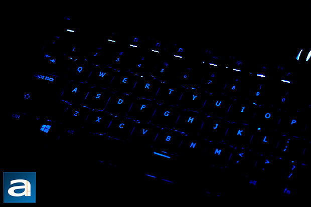 Once you turn off the lights and activate the Gigabyte Force K7's backlit keys, the stealth theme really kicks in. This keyboard features full key backlighting, with three switchable illumination color options in blue, green, and cyan. I have always been a fan of full backlit keyboards, and the Force K7 does not disappoint. The key illumination distribution is reasonably even. You will notice darker spots in keys closer to the outer edge, but it is more pronounced in my photograph above than it is in real life. One cool feature about this Gigabyte keyboard is the backlight can be adjusted by a 'stepless' wheel (It is not exactly stepless, but the increments are very small) to precisely control backlight intensity to accommodate different personal preferences. If you really want true stealth, the backlight can be turned off completely in the same way you toggle through illumination color -- keep clicking the backlight control wheel at the top until you come across your desired setting.