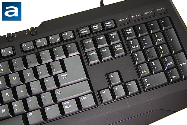 Three standard plus one custom indicator LED corresponding to Num Lock, Caps Lock, Scroll Lock, and Win Lock, respectively, can be found at the upper right hand corner. They glow blue when activated, regardless of the backlight color. Its lighting intensity is also not adjustable, making it permanently bright. The Win Lock key is located next to the Function key across the bottom row of the keyboard, on the right side of the space bar, as shown in the photo above. This is an important feature in any gaming keyboard, because let's face it: How many times have you tried to duck in your favorite FPS while engaging an enemy, only to be killed instantly, because you missed the "Ctrl" key and your game was minimized? Yeah, it is a legitimate issue, and the Win Lock key is a good solution.