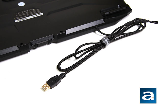 At the back of the Gigabyte Force K7 is the USB cable lead out. It comes out biased to the right and is not detachable. This nicely braided cable extends 1.8m in length, and connects to your computer by a Gigabyte branded gold plated USB connector. When we bring about the question of whether gold plated connectors are actually useful or not, let's just say if it was the actual pins, then possibly -- since gold offers better conductivity than other metals. This theoretically establishes a better connection with your computer, but on a digital signal level, we must understand it is a discrete one or zero; so if anyone tells you they can tell the difference, you can definitely defeat their theory with a double blinded test. Additionally, if you are referring to the gold part of the connector you see on the plug, I would like to point out it actually does not make any physical contact electrically with your computer. In other words, it is nice to have, and it is pretty to look at, but it is not anything significant on a practical level.