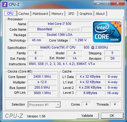 The highest raw overclock I was able to obtain with my Intel Core i7-930 was marginally over 4.00 GHz (4.01GHz to be exact, if you are really that picky) with the base clock set to 191MHz, and the multiplier set at 21x. To test these settings in a good controlled condition, I have disabled Hyper-Threading and Turbo Boost on my processor. With those set, I ran Prime95 on my Gigabyte G1.Sniper on all four cores for an extended period of time to ensure stability. Any higher overclocks resulted in an unstable system, so I stand by my results above.