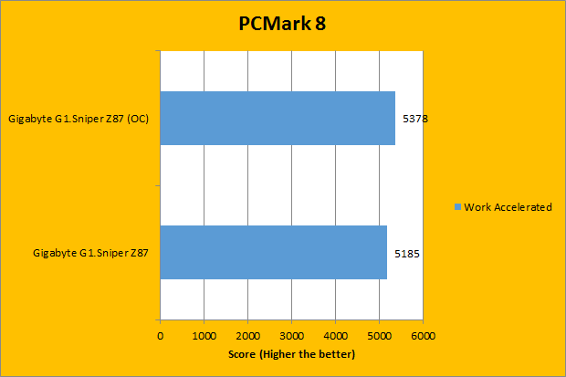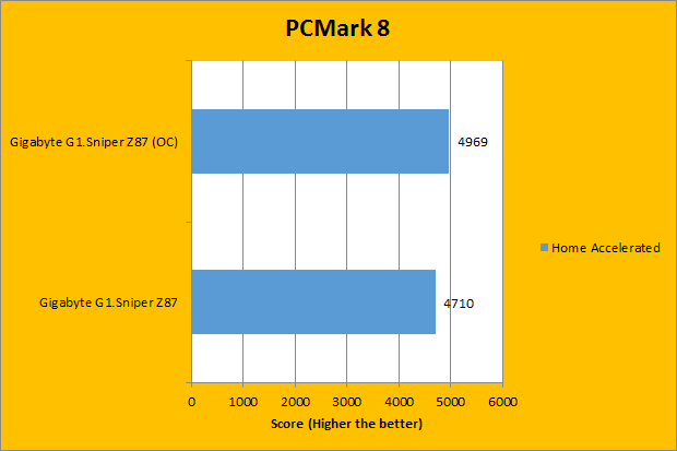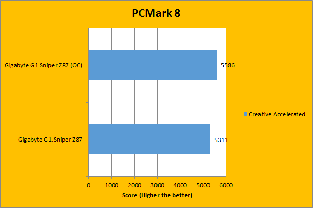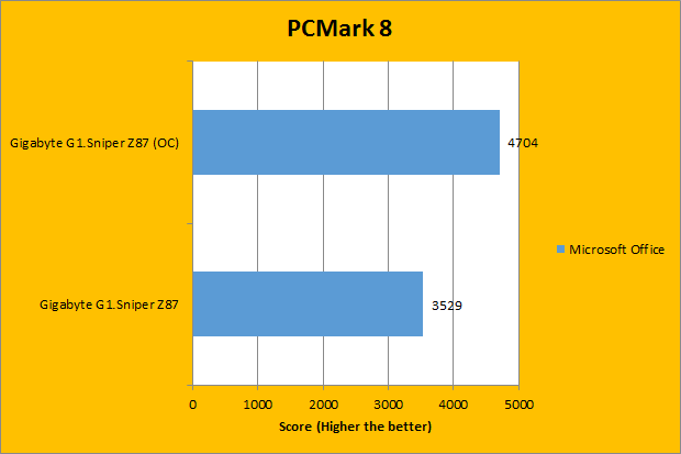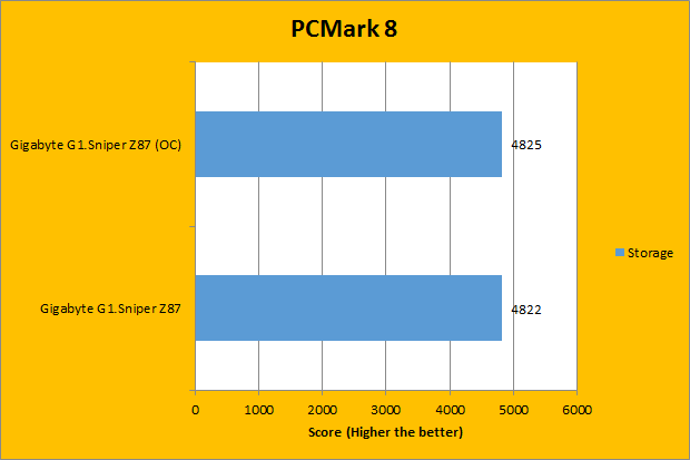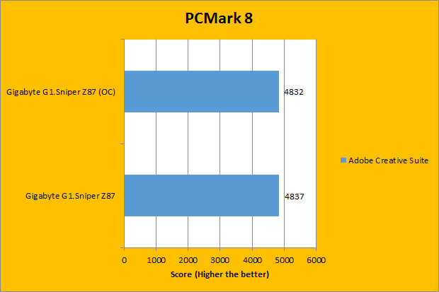 PCMark 8 tests five general categories: Home, Creative, Work, Storage, and Applications. Each category has a series of specific tests. If you think about it, these categories are quite similar to the ones in the previous version, except they are renamed. Taking a look at the results above, there is very little difference between stock and overclock results until we hit Microsoft Office benchmarks. The performance increase here are approximately 5.5%, 3.7%, 5.2%, negligible, negligible yet again, and 33%. I would have expected slightly greater difference in the results. On a side note, when benchmarking Adobe Creative Suite and Microsoft Office, those respective applications must be installed on your computer in order to produce results. What I have installed is Adobe's Creative Suite 6 and Microsoft Office 2013 (Office 365 web installation).