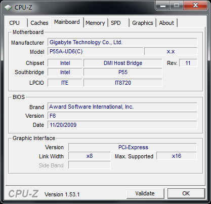 CPU-Z screenshot of the motherboard tab. At the time of benchmarking, we were using Gigabyte's F6 BIOS revision. The latest BIOS revision at press time for the P55A-UD6 is revision F7, available for download at Gigabyte's website to improve memory compatibility.
