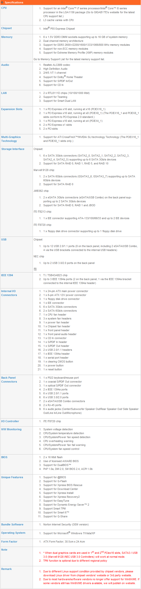 Before we move on, let's take a look at the specifications of Gigabyte's GA-P55A-UD6 motherboard, as obtained from the manufacturer's website: