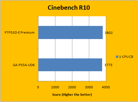 In Cinebench R10, rendering performance is very similar between the two contestants, but not identical. Once again, the Asus P7P55D-E Premium had a consistent minor lead over the Gigabyte GA-P55A-UD6 motherboard. As with our previous tests, we repeated the same benchmark runs to ensure that the results were accurate and consistent across the board.