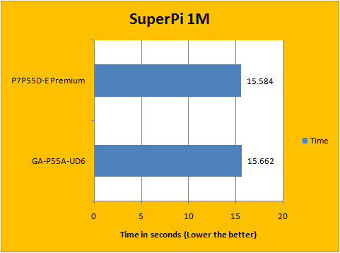 Using SuperPi to calculate to one million digits, our system equipped with the Asus motherboard had a slight performance edge. The end timing put the P7P55D-E Premium at an 0.078 second advantage.