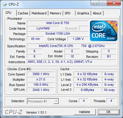 The highest raw overclock I was able to attain using the Gigabyte GA-P55A-UD6 motherboard with my Intel Core i5-750 processor is 3.99GHz; that's with the base clock set to 190MHz with 21x multiplier. Prime95 was run on all four cores for an extended period of time to ensure full stability. That's quite an impressive overclock in my opinion -- a 50% increase over stock on a Nehalem based quad core processor delivers simply incredible performance, and the Gigabyte GA-P55A-UD6 had no issues delivering stable power to the CPU.