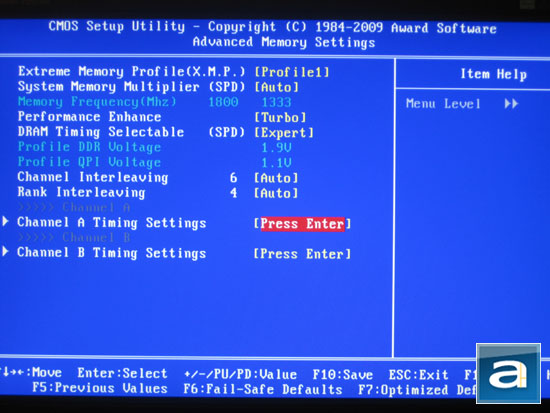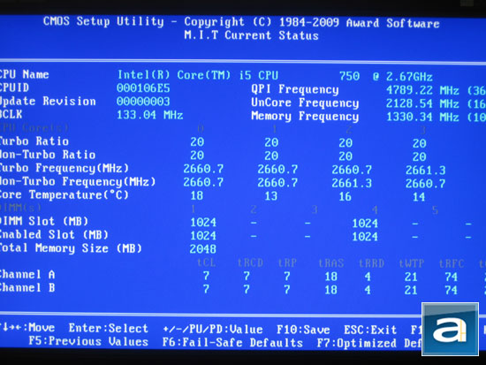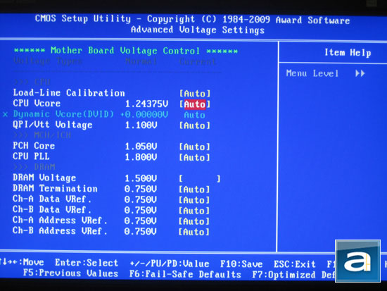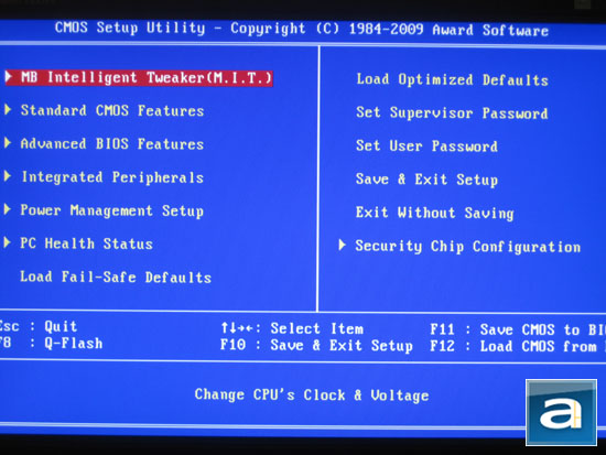 Like all Gigabyte motherboards, the P55A-UD6 uses an Award BIOS. While American Megatrends' BIOS typically uses tabs in addition to pages, Award's BIOS uses a series of menus and pages to categorize each function. Standard adjustments and information links are placed on the left column, and miscellaneous controls are placed on the right column. While I am not going to dig through every menu in the BIOS for this review, I am going to point you to the Motherboard Intelligent Tweaker screens. These screens should pose the most interest, since this is where you do all the overclocking fun -- and the rest should be fairly self-explanatory, haha.