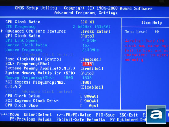 The Advanced Frequency Settings screen permits the user to adjust processor settings. Adjusting the CPU clock ratio and BCLK frequency brings up a dialog box with a field which requires the user to enter a decimal number, while adjusting the PCI Express frequency requires the user to scroll through a list of frequencies starting at 90MHz, and scales up by 1MHz every time. The bus speed, Uncore clock ratio, Uncore frequency, and memory frequency values will be updated immediately as you change the settings. Under the Advanced CPU Core Features section are options for enabling or disabling features such as Turbo Mode, SpeedStep, and enabled cores. It is also possible to select XMP profiles from the Advanced Frequency Settings screen as well.