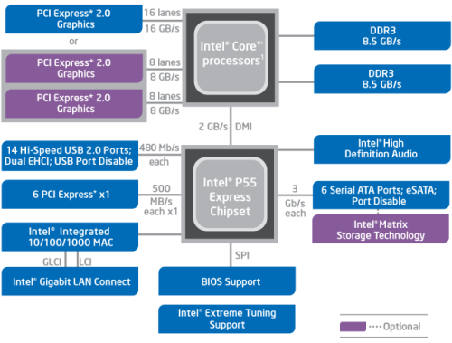In addition to the DDR3-1333 64-bit wide on-die memory controller, Intel also integrated 16 PCI Express 2.0 lanes into the processor to overcome the inherent bandwidth limitation of the DMI interface. There are only two chips on the LGA1156 platform, as seen in the block diagram above. What was previously known as the Southbridge takes care of the standard connection interfaces such as providing up to 14 USB ports and 6 SATA ports, as well as providing six additional PCI Express lanes for PCIe based devices such as Ethernet. As many Northbridge functions are now on the CPU itself as aforementioned, the P55 chipset doesn't do nearly as much as it did in the past -- Intel resolved to call it the Platform Controller Hub, or PCH, instead. Later in this review, you might look at the photos and see that the Gigabyte GA-P55A-UD6 motherboard appears to have a Northbridge and Southbridge... what the heck? This is certainly no mistake -- we'll show you what's going on the following page.