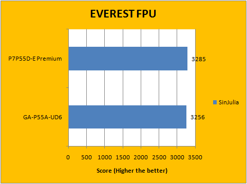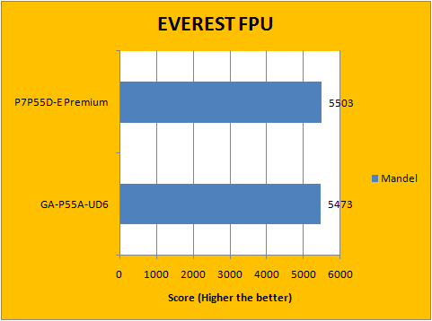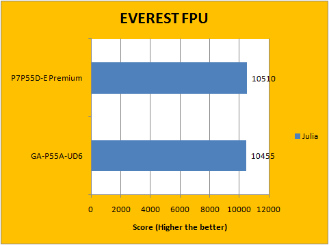 Again, the results are extremely close between the P55A-UD6 and P7P55D-E Premium. This is certainly within our expectations, and like the EVEREST CPU synthetic tests on the previous page, the EVEREST FPU results are again consistent and comparable. The Gigabyte motherboard is again a hair behind the Asus motherboard, but the difference is certainly not significant at all.