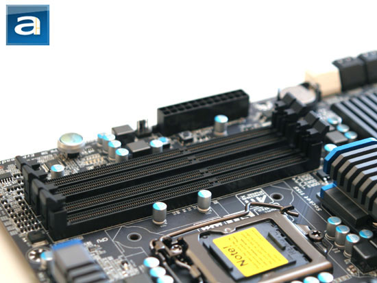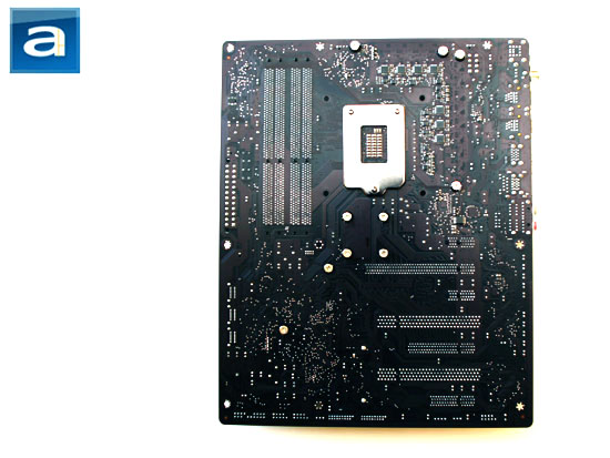 A shot of the back of the motherboard. It is a relatively clean design, nothing in particular here. Just like Gigabyte motherboards from last year, all those "Crazy Cool" copper plates are gone, so it won't interfere with aftermarket heatsink backplates during installation. What you will find is the standard Intel backplate, but all heatsinks designed for LGA1156 should be designed to work with the backplate in its place. Two ounces of copper were used on the power and ground layers of the P67A-UD5 to improve its cooling efficiency by spreading the heat out more evenly, as well as delivering more power more efficiently to its components by lowering the PCB impedance. Regarding the use of capacitors, the use of surface mounts is evident, as shown in the image above. Pins still stick out for other components, for example, the RAM socket pins and PCI slots -- since SMT is not capable of withstanding higher mechanical stress required for this purpose.