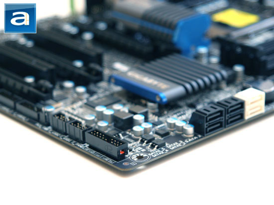 Six color coded Serial ATA connectors are angled perpendicular to the motherboard for optimal cabling convenience. All SATA ports are native to the P67 chipset; and supports RAID 0, 1, 5 and 10. The white ports are SATA 6Gb/s ports, while the black ports are SATA 3Gb/s ports. The latter of which are the ones affected by the recall. Gigabyte's GA-P67A-UD5 motherboard does not feature any PATA or floppy connectors, which in my opinion it is about time we got rid of them, haha. Missing from Gigabyte's flagship board is a two-digit display that shows an error code if there are any POST problems, so you will have to listen to the good old beep codes on the UD5.
