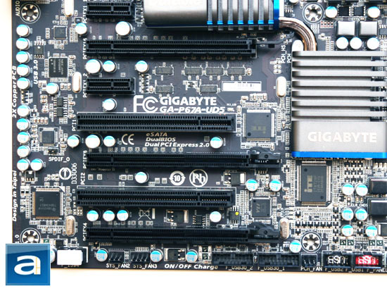 The expansion slots, in order from the top, are: PCIe x1, PCIe x16, PCIe x1, PCI, PCIe x16, PCI, and another PCIe x16 slot. The Gigabyte GA-P67A-UD5 takes the best of both worlds and supports both CrossFireX and SLI. However, do keep in mind that only the first PCIe x16 slot is a "true" PCIe x16 slot; the second one will do a split (Share the bandwidth) with the first slot if a graphics card is installed to become two x8 slots. This is due to limited availability of PCIe lanes provided by Sandy Bridge core processors. The third slot isn't even a true x16 slot by any means; it only gets four lanes allocated to it from the chipset -- and reduces to an x1 slot when the other PCIe x1 slots are populated. So while you can install a video card there, you won't get full bandwidth. The top PCIe x1 slot will only support very short cards, since the heatpipes will get in the way. Since Intel's P67 chipset has no native support for PCI slots, the ones found on the Gigabyte P67A-UD5 are connected to one of the PCI Express lanes by an ITE IT8892 bridge chip.