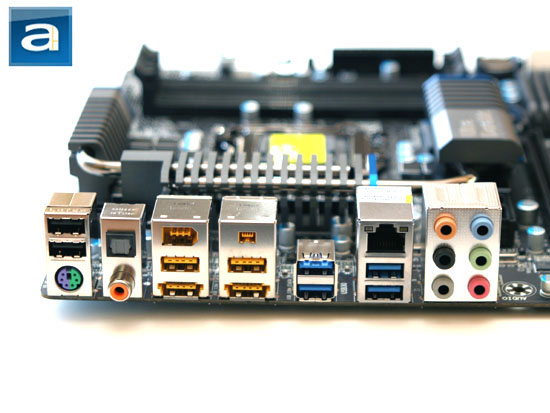 The back panel offers a generous array of available external connectors. It features one dual purpose PS/2 connector provided by its ITE IT8728 chip, and a total of ten (!) USB ports of varying colors. Despite the fact that the USB ports come in yellow, black, and blue, the only Renesas D720200 powered USB 3.0 ports on the P67A-UD5 are the ones colored in blue -- and there are four of them. The two next to the PS/2 port are regular USB 2.0 ports. As shown in our photo above, two out of four yellow USB 2.0 ports are combo jacks that double as eSATA connectors. It would have been less confusing if only the special ports carry this contrast. One thing to note is that these eSATA ports provided by Marvell's 88SE9128 SATA 6Gb/s controllers are capable of delivering power. On the topic of USB ports, rather than the standard 500mA power delivery, the Gigabyte GA-P67A-UD5 is able to provide up to 1500mA on each USB port. It is certainly a very nice touch by the engineers, since many devices such as 2.5" external hard drives require 1A at 5V to work. This saves the need to use two USB ports due to insufficient power delivery. Additionally, the On/Off charge function allows the USB ports to deliver power even when your computer is turned off. Two Firewire ports powered by Texas Instruments' TSB43AB23 controller is found, as well as one Realtek RTL8111E based Gigabit LAN port connected via one PCIe lane. I was surprised to see only one Gigabit LAN port on such a high end motherboard, and that's from the same company that brought us a whopping four a few years back. The rest are audio connectors based off the Realtek ALC889 codec; both S/PDIF coaxial and optical outputs can be seen in addition to the six standard 3.5mm analog jacks.