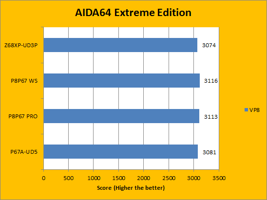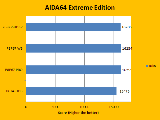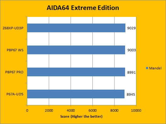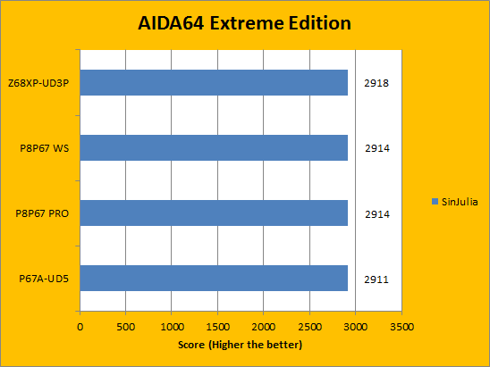 Much like the results seen on the CPU benchmarks from AIDA64 Extreme Edition, the FPU benchmarks results seen on the Gigabyte Z68XP-UD3P differ on average no more than 1% when compared to the other three motherboards already previously reviewed. Next on the list is the final set of benchmarks from the same program, with more focus on the memory portion of the computer system.