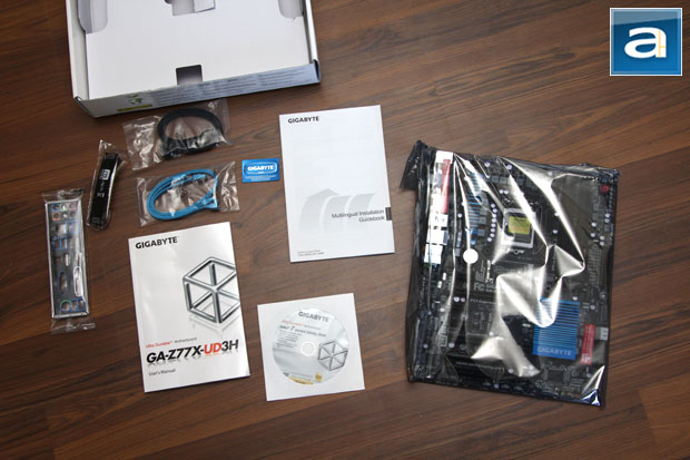 Upon opening the box, a surprisingly simple bundle accompanies the Gigabyte GA-Z77X-UD3H from the factory. Basically, everything you see in the photo above is everything you will get. Besides the motherboard itself, you will receive four SATA cables, one SLI bridge, a rear I/O shield, manual, installation guide, driver/software DVD, and that's it. Well, plus a Gigabyte sticker for what it is worth, haha. This is by far the least amount of accessories I have ever seen out of a motherboard retail package, but since this is a mainstream performance product, you really can't expect too much. To be honest, I don't actually use 90% of the stuff that comes with high end motherboards anyway, and for $150 at press time, let's cut Gigabyte some slack, shall we?