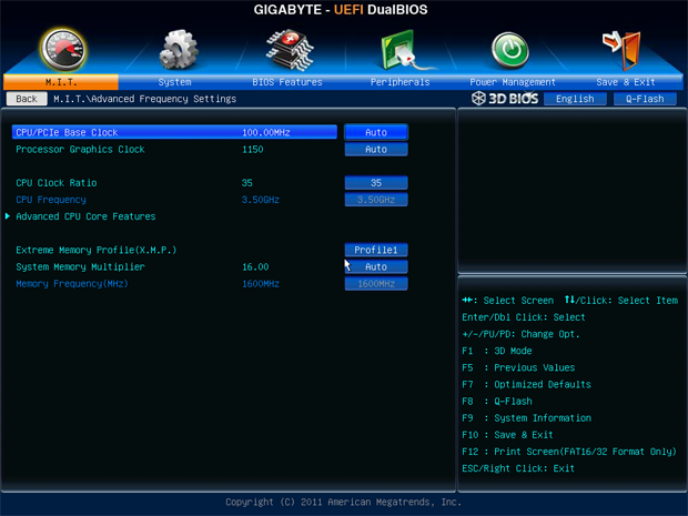 Ahh, the UEFI BIOS. With the GA-Z77X-UD3H, Gigabyte finally got ship a motherboard with a graphical user interface setup screen like all other major manufacturers. What is different is the new 3D BIOS, which is an especially cool feature in my personal opinion. Presented with an image of the motherboard, the user can click on different regions assisted by a pop-up activated on hover to configure corresponding settings. This presents a very visual way of tuning your PC, and it really does a great job at toning down the intimidation upon people who are new to the scene. Of course, as a traditional enthusiast, I am more inclined to pop back into Advanced Mode, so I will spend a little more time discussing that.