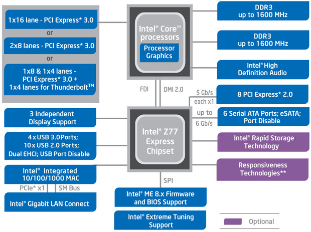 Six new chipsets designed for Ivy Bridge processors are available at press time, including the Z77, Z75, H77, Q77, Q75, and B75. Previous generation chipsets such as P67 and Z68 can support Ivy Bridge, given a proper BIOS update is available from your motherboard manufacturer. All 7-series chipsets are backwards compatible with Sandy Bridge CPUs. Codenamed Panther Point, the Gigabyte GA-Z77X-UD3H features the enthusiast Z77 chipset, as the motherboard name suggests. Branching off the processor are sixteen available PCI Express 3.0 lanes, and can be set to either 1x16, 2x8, or 1x8/1x4 plus a Thunderbolt port, as shown in the block diagram above. The Platform Controller Hub provides eight PCI Express 2.0 lanes. Ivy Bridge CPUs also has native support for a pair of dual channel DDR3-1600 RAM slots, and can scale up to DDR3-2800 speeds. We are also happy to finally see native support for up to four USB 3.0 ports (Previous chipsets had USB 3.0 support only via a third party controller) and two SATA 6Gb/s ports for your ballin' SSDs. Four additional SATA 3Gb/s ports are provided for everything else. The rated TDP for all Panther Point chipsets is 6.7W. Of course, the actual number of ports available on your motherboard is dependent on the manufacturer and model.