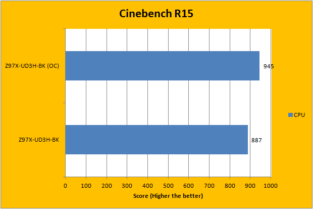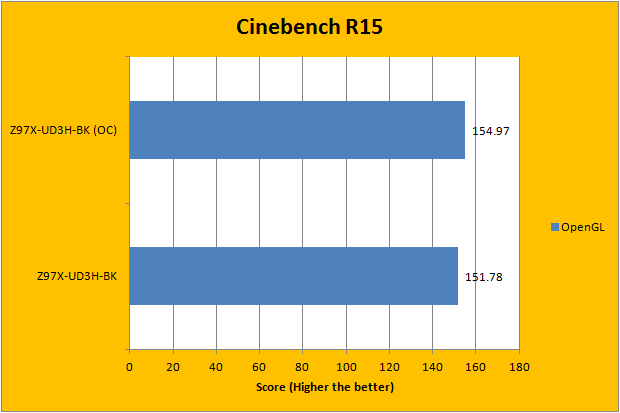 Cinebench R15 is separated into two tests: One tests the CPU image rendering performance, while the other benchmarks the OpenGL video rendering performance. Obviously, having a fast processor and a powerful video card, respectively, will play a much more significant role in determining these scores, so I was quite interested in what the overclocked Intel Core i7-4790K could do on the Gigabyte GA-Z97X-UD3H-BK. In the OpenGL test, we gained about 3 FPS, which is practically gaining pocket change on big bills at best. However, the CPU test provided a more noticeable increase. At stock, it is not quite the Chinese lucky number, but overclocked, we saw a sweet 6.5% kick up from stock configuration. I am not complaining.