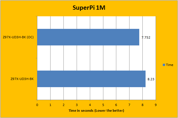 We have always included SuperPi in our benchmark results, because it is a quick and dirty run that always proves to be interesting. It is neither the fastest way to calculate Pi, nor is it the most challenging. But being an enthusiast at heart, this program has always provided interesting results for showing off your overclocking prowess at your favorite online forum. Any increase in clock speed will indeed make a difference in this test, and even with only an additional 300MHz from the Core i7-4790K's 4.4GHz Turbo Boost specification, the Gigabyte GA-Z97X-UD3H-BK running the overclocked processor easily shaved off half a second off the baseline time.
