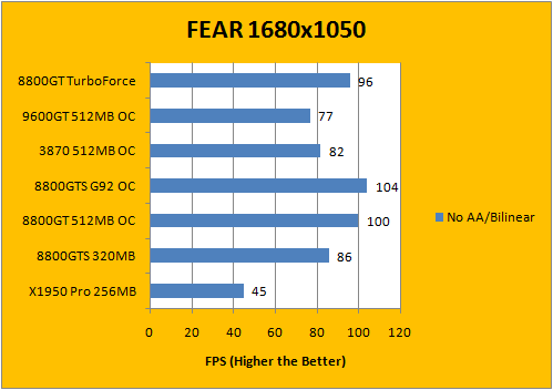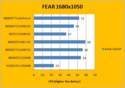 As usual, our first test that comes along in our standard benchmark set is FEAR. All settings were set to maximum and the only manipulated variables were AA and AF. 1680x1050 widescreen resolution is used to put more emphasis on the graphics card and less on the rest of the system. Soft Shadows were turned on; which is one of the more video card taxing settings in this game. The Gigabyte 8800GT TurboForce performed well within expectations; at clocks of 700/920 the Gigabyte overclocked card is slightly behind the Asus 8800GT TOP at 700/1000.