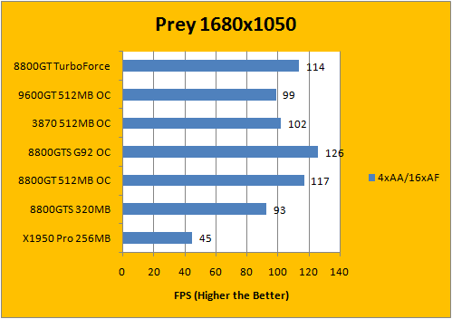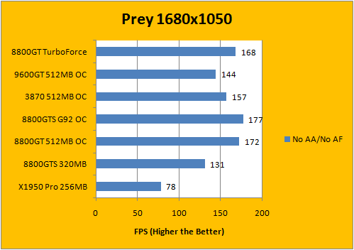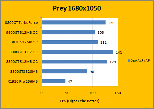 Based upon the Quake 4 engine, we've used the com_fixedtic 1 command to remove the 30fps frame cap on by default. Generally speaking, G92 based 8800 series cards (8800GT, 8800GTS 512MB) are very capable in this game -- and the Gigabyte 8800GT TurboForce is definitely no exception. Again, the slower memory frequency had the Gigabyte 8800GT TurboForce to be slightly behind the faster clocked 8800GT from Asus.