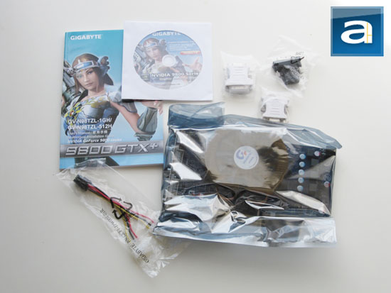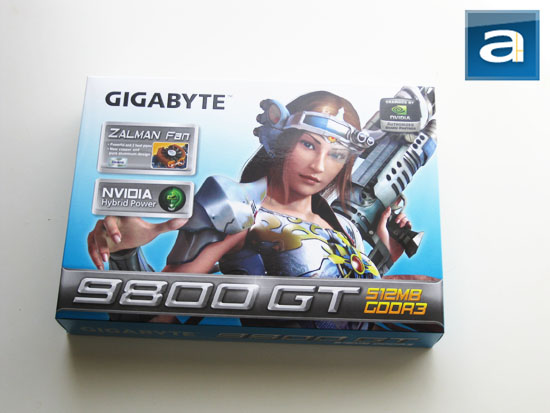 The retail box of the Gigabyte GeForce 9800GT 512MB graphics card is featured in a relatively small package -- it's nothing excessive in terms of size in relation to what's contained inside. The front of the box is designed with a primarily teal and white color scheme and occupied with a 3D rendered female mascot; along with standard information such as Gigabyte's logo at the top left corner, and the GPU model in large bold text across the bottom. Flashes of features such as NVIDIA HybridPower and the Zalman HS/F are placed in islands under the Gigabyte logo. Specifications and elaboration of feature highlights such as Gigabyte's Ultra Durable 2 implementations are printed at the back with pretty icons and pictures.