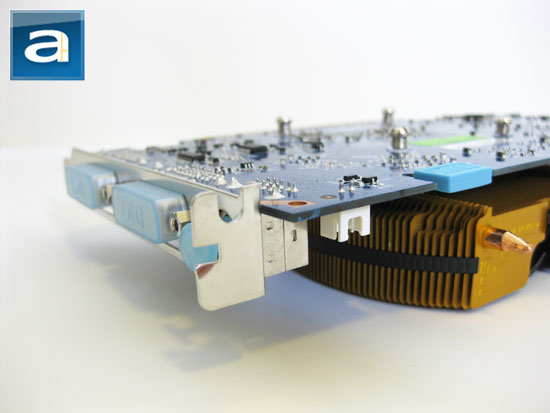 The base of the heatsink has a shiny aluminum finish to it, with the two heatpipes leading away from the base to more evenly spread heat throughout the heatsink fins to be more evident in our photo above. The heatsink fan is connected to a two-pin fan connector on the Gigabyte 9800GT 512MB. Notice that there's no fan RPM monitoring on this card; it also lacks the circuitry on the board to sense fan RPM -- and the fan runs at a constant high RPM at all times regardless of load or temperature. We found the Gigabyte 9800GT be quite loud even under idle conditions.