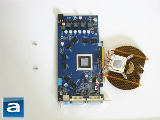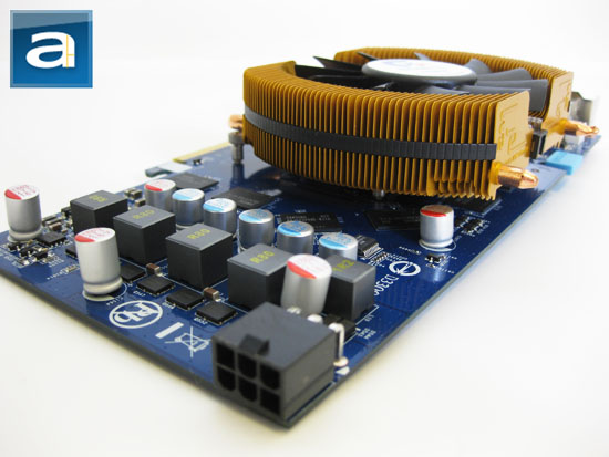 The Zalman flower shaped heatsink brings airflow well to all components of the board in addition to directly cooling the G92 core. We were quite surprised to see that the memory chips aren't cooled though, since Gigabyte does promote overclocking capabilities with this card -- including the included Gigabyte HUD software which allows overvolting. The Zalman heatsink/fan brings a considerable amount of airflow over the memory chips; but having ramsinks would definitely be beneficial.