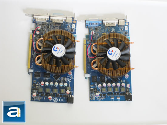 Shown above are the Gigabyte 9800GT 512MB on the left, and the Gigabyte 8800GT TurboForce on the right. While both cards are essentially the same (With the exceptions mentioned on the previous page), the Gigabyte 9800GT 512MB is about a centimeter longer than the Gigabyte 8800GT TurboForce. Otherwise they're mostly the same -- most prominently is the preinstalled Zalman VF-830 aftermarket heatsink/fan. This heatsink/fan is a lightweight aluminum unit with two copper heatpipes; on top of it is an 80mm fan. It primarily cools the GPU through direct contact, with its flower-shaped design bringing airflow over most of the board itself. The Gigabyte 8800GT TurboForce's PCB is the shortest we've seen, and the Gigabyte 8800GT's PCB is almost as competitive in size. Both boards are manufactured by Gigabyte's facilities in Taiwan.