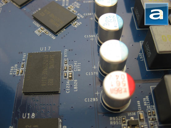 A total of eight Samsung K4J52324QE-BJ1A memory chips are implemented on the Gigabyte 9800GT for a combined 512MB video memory. More information on these memory chips can be found on Samsung's website. These memory chips operate at stock 1.9V at maximum frequency of 1GHz -- we were actually quite surprised that Gigabyte actually downclocked these chips by 100MHz out of the box. These chips are identical to the one used on the Gigabyte 8800GT TurboForce 512MB.