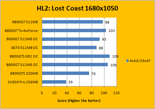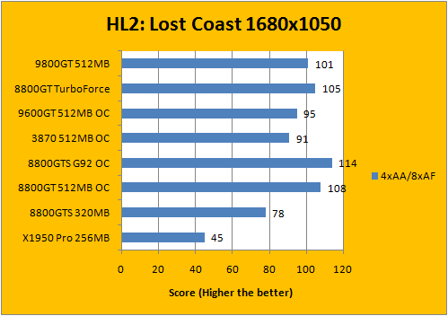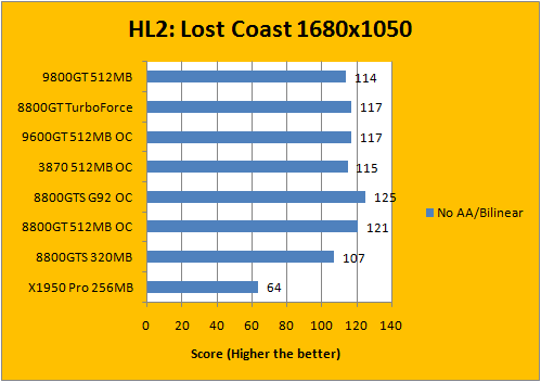 Half-Life 2: Lost Coast is traditionally a very popular benchmark for video cards for its efficient use of hardware, as well as excellent HDR implementation and facial textures. The Source engine scales fairly well with different cards; and at 1680x1050 with everything maxed out with AA and AF as manipulated variables, the Gigabyte 9800GT TurboForce is again a few frames behind the higher clocked Asus 8800GT TOP and Gigabyte 8800GT TurboForce out of the box, but still faster than a 9600GT factory overclocked unit. This is certainly well within expectations and the Gigabyte 9800GT is fast and consistent with everyone else.