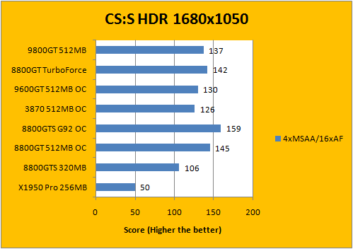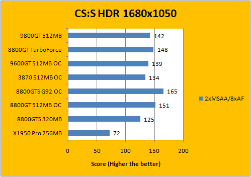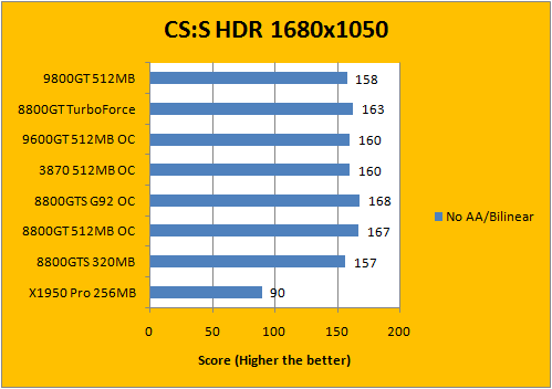 Our custom timedemo for Counter-Strike: Source, like our Half-Life 2: Lost Coast custom timedemo, generally reflects average real life performance. Generally speaking, all cards are very capable in this Source engine based game. Results are consistent with regards to the Gigabyte 9800GT 512MB in other games; where it is only a few frames behind the 8800GT TOP from Asus and the 8800GT TurboForce in each benchmark due to lower stock frequencies.
