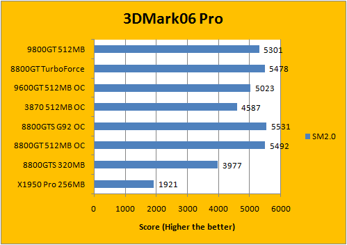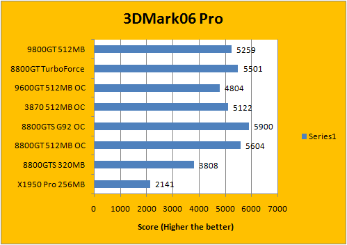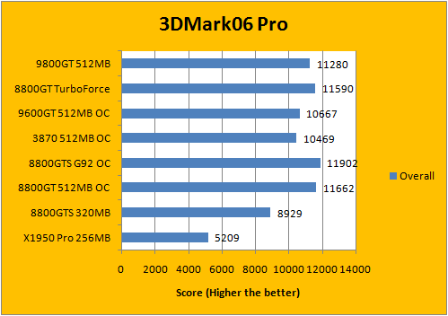 As far as synthetics go, 3DMark06 is certainly everyone's favorite -- and we've put our cards through the run as well. Running under our Windows XP platform, the Gigabyte 9800GT 512MB performed very well against the rest -- again, due to the 100MHz core and frequency penalty against the Asus 8800GT TOP (But only 20MHz memory frequency penalty against the Gigabyte 8800GT TurboForce), the Gigabyte 9800GT 512MB scored slightly lower. The performance is still very good and the memory frequency can easily be made up -- since the Samsung chips used on the Gigabyte 9800GT 512MB are designed to run at 1GHz by Samsung anyways. Our overclocking results are on the next page.
