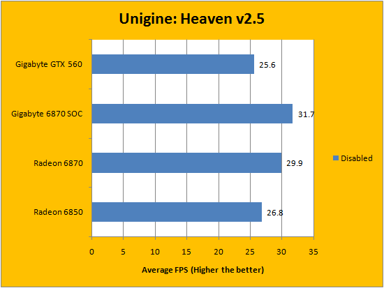 Unigine's Heaven v2.5 shows users what the company's game engine is capable of. Developed in 2009, one of the biggest features of Unigine is its advanced OpenGL 4.0 and DirectX 11 renderer. This is an excellent benchmark, because there are currently fourteen Unigine licenses used for game development at press time. For our tests, we left it at its maximum settings of 8xAA and 16xAF, using tessellation as its only manipulated variable to measure the respective performance of the tested graphics cards. The average frame rate is shown in our charts above. AMD heavily advertises their 6800 series' greatly optimized tessellation performance, and it really paid off here.