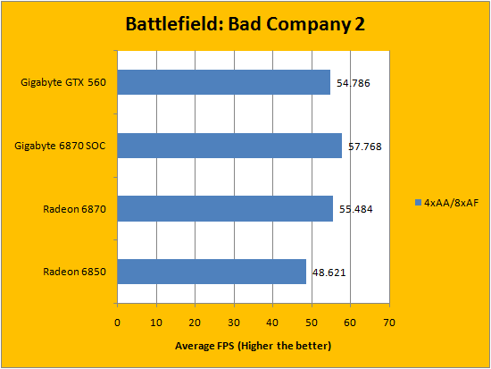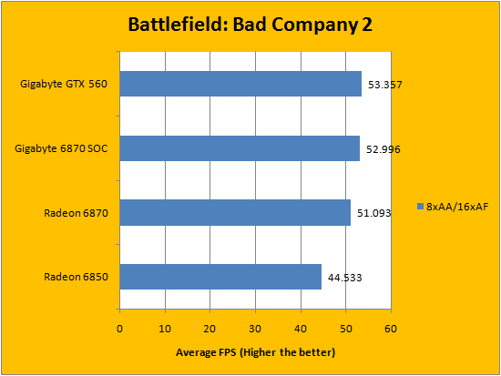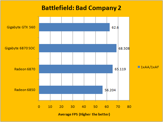 Battlefield: Bad Company 2 runs off the Frostbite 1.5 engine, developed by EA Digital Illusions CE. It is a DirectX 11 game, released on March 2, 2010. We benchmarked our graphics cards on the Heart of Darkness level with everything maxed out at 1920x1200; the only manipulated variable is anti-aliasing and anisotropic filtering, as reflected on the labels in our graphs above. Since Bad Company 2 does not have built in benchmarking tools for custom timedemos, we ended up playing the same level manually in the same manner repeatedly to obtain our results. The results proves to be quite interesting, because we can see the GTX 560 scales really well with changes to AA and AF settings. Initially, at 1xAA and 1xAF, it was about 3fps behind the reference 6870. The gap began to close to less than 1fps at 4xAA and 8xAF. Once we have increased the settings to 8xAA and 16xAF, the Gigabyte GTX 560 actually managed to beat even the overclocked Radeon HD 6870.