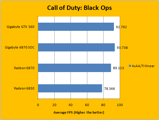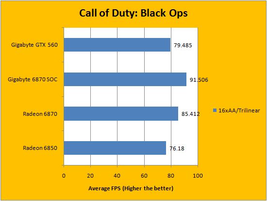 Call of Duty: Black Ops is uses Infinity Ward's IW engine, and began selling to the general public on November 9, 2010. While this is a pretty recent release, this game is not particularly demanding as far as graphics are concerned, as it runs off an older engine. Like Battlefield: Bad Company 2, Black Ops does not have a built in benchmarking system for custom timedemos (That works properly), so we gave up and just did what we did with the previous game. The manual test involved a run through the S.O.G. level in the exact same gameplay sequence with all details set on maximum. Since the game has a setting that restricted it to 85 fps maximum, we edited the configuration file to uncap its performance to 500 fps. From our graphs above, it is interesting to note that while the AMD Radeons scaled really well with AA and AF adjustments, the NVIDIA based contender did not. This is quite the opposite of what we have seen on the previous page. At first, the competition was truly neck to neck, but at 16xAA, the gap really widened out.